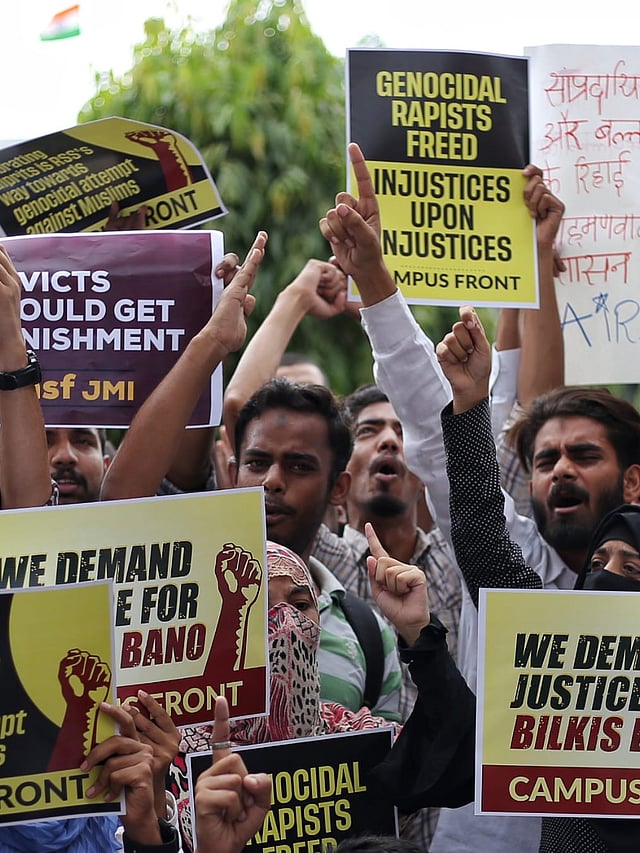 दिल्ली के जामिया मिल्लिया इस्लामिया में छात्र-छात्राओं ने बिलकिस बानो के बलात्कारियों को रिहा किए जाने के खिलाफ विरोध प्रदर्शन किया।