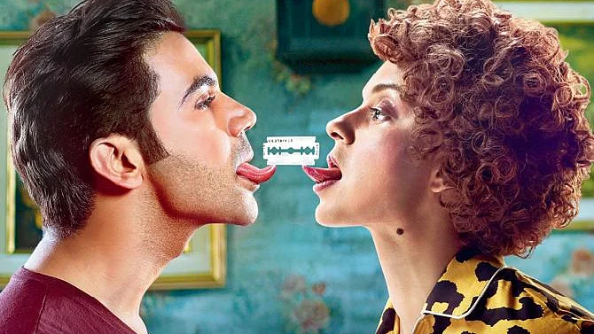 मोशन पोस्टर की शुरुआत होती है राजकुमार राव से जो अपने मुंह में सिगरेट लिए खड़े हैं और कंगना रनौत ने हाथ में एक मछली पकड़ रखी है, जिसे वो आग में सेंक रही हैं। कुछ दिनों पहले फिल्म का एक पोस्टर रिलीज हुआ था, जिसमें दोनों अपनी जीभ पर ब्लेड उठाए नजर आए थे।
