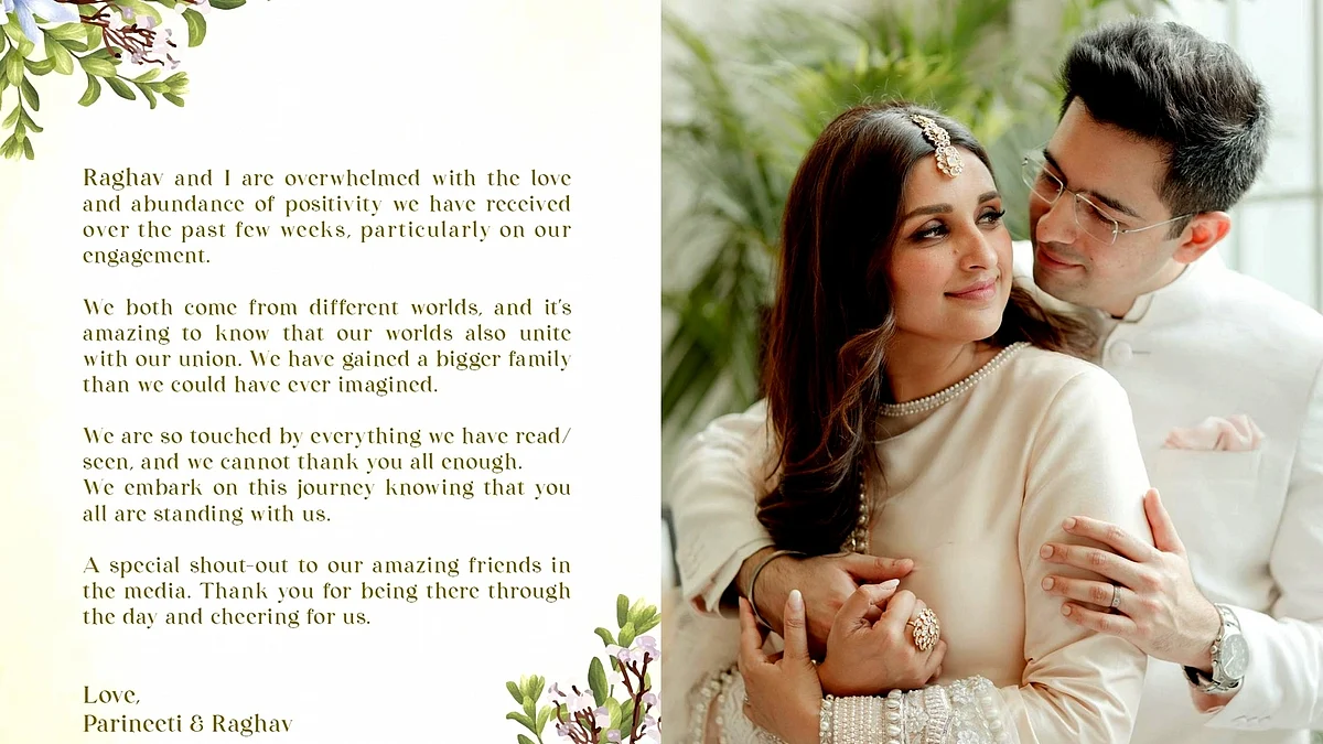 बॉलीवुड एक्ट्रेस परिणीति चोपड़ा ने उन्हें और उनके मंगेतर राघव चड्ढा को मिल रहे प्यार के लिए धन्यवाद नोट लिखा है। सगाई के दो दिन बाद, परिणीति ने सोमवार को इंस्टाग्राम पर लिखा, राघव और मैं पिछले कुछ हफ्तों में मिले प्यार और पॉजिटिविटी से बहुत खुश हैं, खासकर हमारी सगाई पर। हम दोनों अलग-अलग दुनिया से आते हैं, लेकिन ये देखकर अच्छा लगता है कि हमारी दुनिया भी हमारे मिलन के साथ एकजुट हो गई है। जितना हमने सोचा था, उससे कही ज्यादा बड़ा परिवार मिला है। उन्होंने आगे लिखा: हमने जो कुछ भी पढ़ा/देखा है, उससे हम बहुत प्रभावित हुए हैं, और हमारे पास धन्यवाद देने के लिए शब्द नहीं है। हम इस उम्मीद से इस यात्रा की शुरूआत कर रहे हैं कि आप सभी हमारे साथ खड़े हैं।