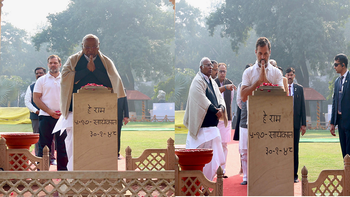महात्मा गांधी की पुण्यतिथि पर राजघाट पहुंचे कांग्रेस अध्यक्ष खड़गे और राहुल गांधी, पुष्पांजलि अर्पित की