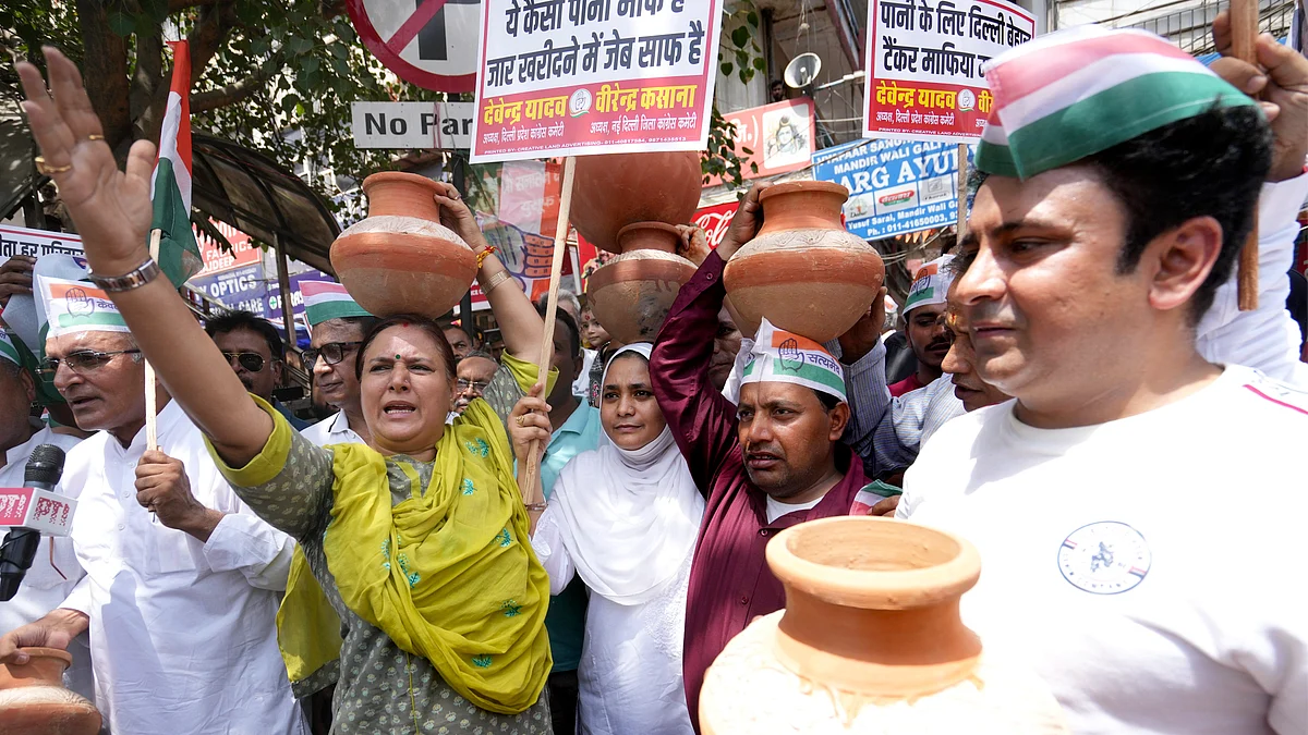 सिर पर मटके और हाथ में कांग्रेस के झंडे लेकर प्रदर्शनकारियों ने दिल्ली सरकार और मुख्यमंत्री अरविंद केजरीवाल के खिलाफ नारेबाजी की। बाद में, उन्होंने मटकों को जमीन पर पटककर फोड़ दिया।