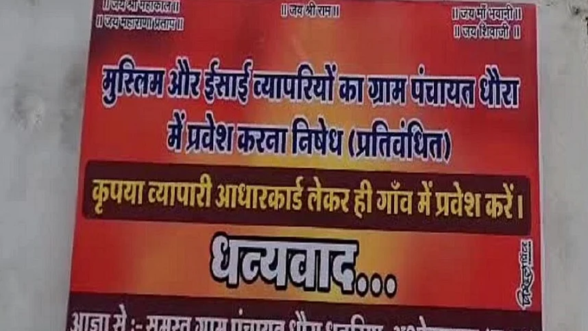 मध्य प्रदेश के अशोक नगर जिले के एक गांव में बाजाप्ता पोस्टर लगाकर मुस्लिम और ईसाई समाज के व्यापारियों के प्रवेश पर रोक लगाने का मामला सामने आया है। साथ ही पोस्टर में आधार कार्ड रखने वालों को ही गांव में प्रवेश देने का ऐलान किया गया है। मामला सामने आने पर तूल पकड़ने के बाद पुलिस-प्रशासन के दखल के बाद पोस्टर को हटा दिया गया है।