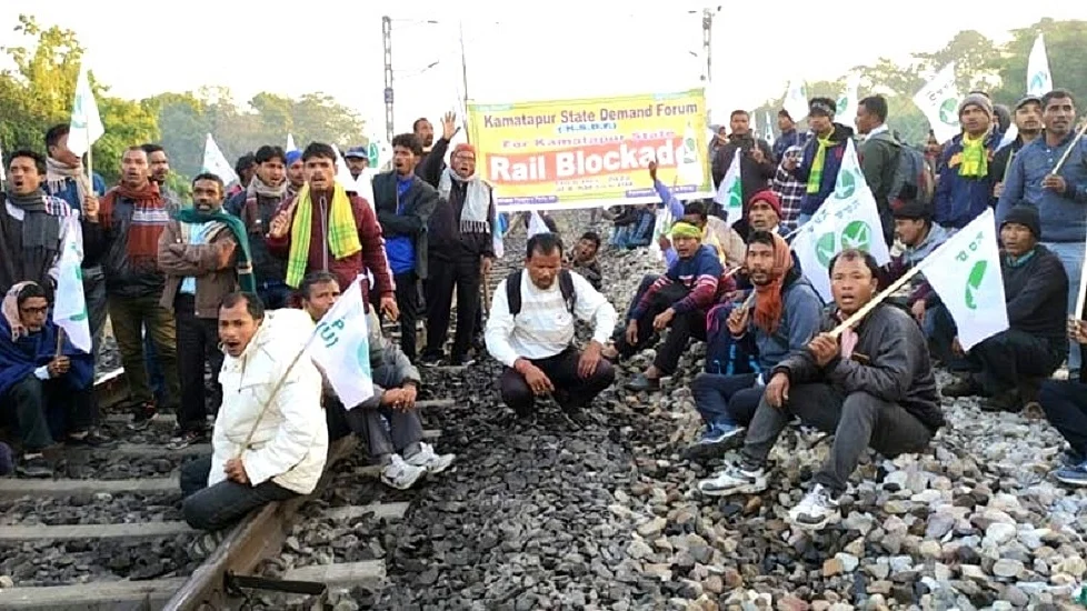 अलग कामतापुर राज्य की मांग को लेकर कामतापुर स्टेट डिमांड फोरम (केएसडीएफ) द्वारा रेल लाइन पर लगाए गए अवरोध के कारण मंगलवार को उत्तर बंगाल के विभिन्न हिस्सों में ट्रेन सेवाएं बाधित रहीं। मंगलवार सुबह से शुरू नाकेबंदी के बाद कई मेल, एक्सप्रेस और मालगाड़ियां विभिन्न स्टेशनों पर फंसी रहीं।