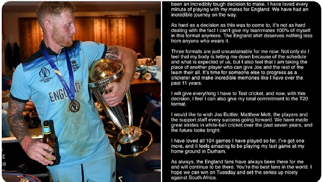 अपने इस फैसले के बारे में जिक्र करते हुए स्टोक्स ने बताया कि उनके लिए यह फैसला लेना बहुत मुश्किल था, साथ ही उन्होंने बताया कि अपने साथियों के साथ खेलते हुए उन्होंने हर लम्हे का लुत्फ लिया। इसी में उन्होंने बताया कि मैं मंगलवार को डरहम में इंग्लैंड के लिए ODI क्रिकेट में अपना आखिरी मैच खेलूंगा। उन्होंने रिटायरमेंट का कारण बताते हुए कहा कि उनके लिए तीन फॉर्मेट बहुत ज्यादा हैं और अब मेरा शरीर भी साथ नहीं दे रहा है।